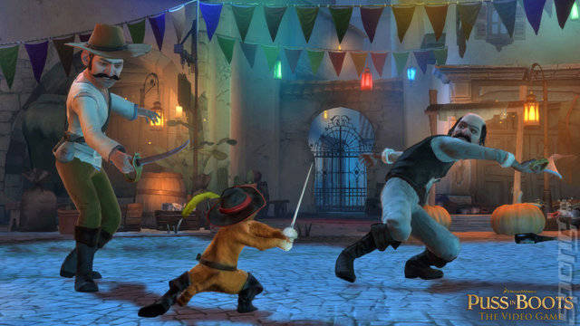 Step into the boots of Puss In Boots, star of the upcoming film from DreamWorks Animation, and use your sword fighting moves and sly skills to become the legendary hero! Master the style and charm of Puss in Boots in an engaging swashbuckling experience. Duel banditos with style and flair, use cat-like sneaking skills to fool your foes, and team with characters from the film to catch the Golden Goose … plus, strum your guitar to serenade the señoritas along the way! It’s the adventure of nine lifetimes!