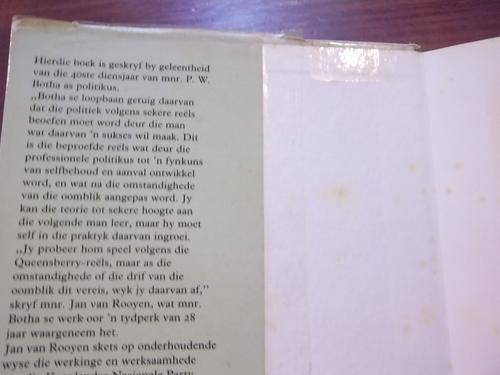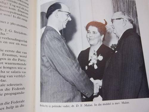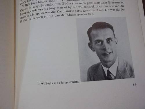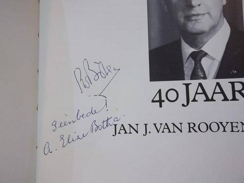 PW Botha - 40 Jaar - Jan J. van Rooyen. Signed by both Mr PW Botha and Mrs Elize Botha. First edition. 1976. Hardcover with dj. Dj has been stuck to boards and repaired in places with sellotape. Some foxing in places. (See photos). 112pp. Generally very good condition. Postage in SA - R40 SAPO or R99 Postnet to Postnet.