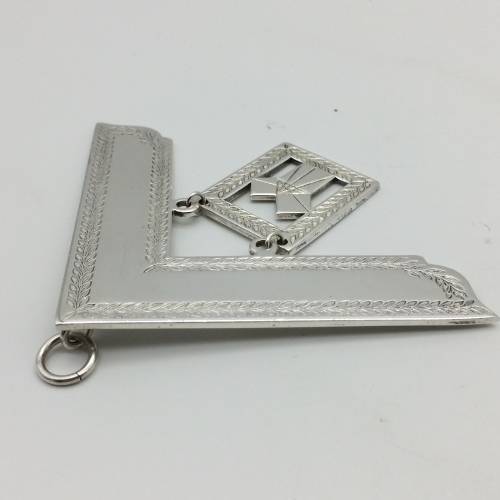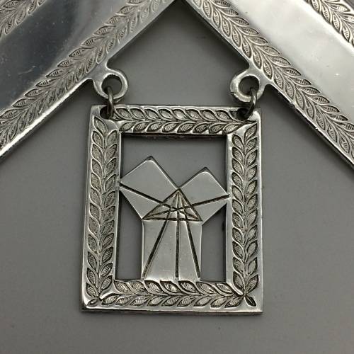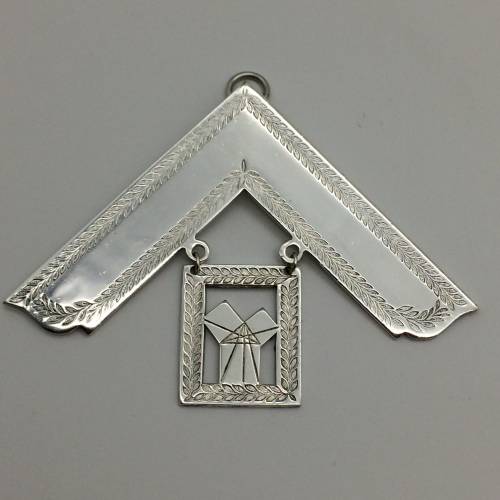 This early, large, very good quality 'Past Master' jewel is in excellent condition. The heavy jewel is beautifully decorated with borders and leaves. There are no markings at all on this jewel, so probably silver plated on a heavy base metal. It measures 12.5cm x 9cm.