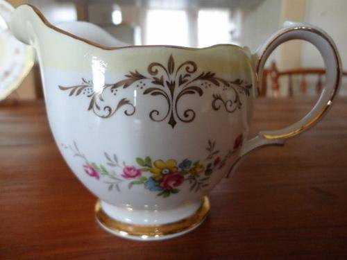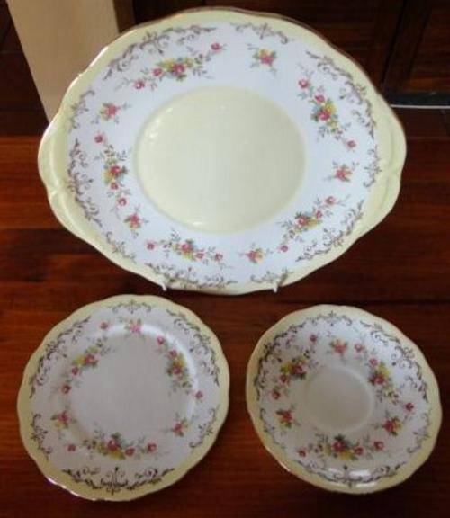 6 TRIOS, A CAKE PLATE, CREAMER AND SUGAR BOWL.  NO CHIPS, CRACKS OR STAINS.
