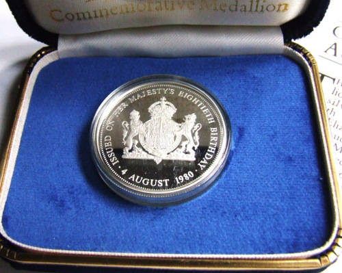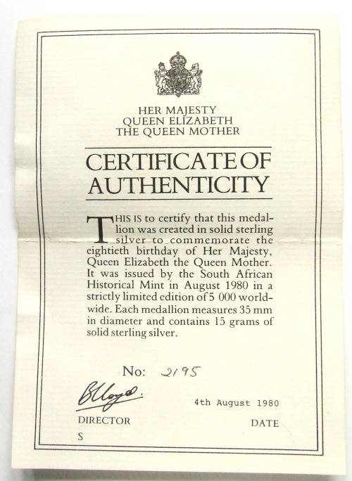 Queen Mother 80th Birthday Silver Medallion with COA 2195