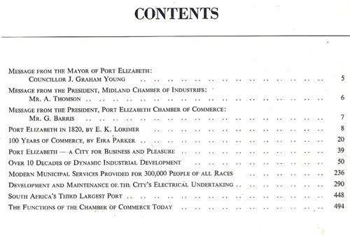 | TITLE | PORT ELIZABETH. FROM A BORDER GARRISON TOWN TO A MODERN COMMERCIAL AND INDUSTRIAL CITY. (A Volume Issued On The Occassion Of The First Hundred Years Of The Port Elizabeth Chamber Of Commerce). |