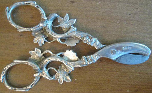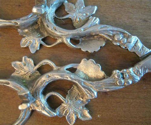 THESE GRAPE SCISSORS ARE TRUELY BEAUTIFUL IN EVERY WAY, BUT THEY HAVE ME PUZZELED AS I AM NO EXPERT WHEN IT COMES TO SILVER. THERE IS A NUMBER 90 ON THE BLADE WHICH I THINK, MEANS THE ITEM HAS BEEN PLATED WITH 90gr OF SILVER MAKING IT A QUALITY PIECE. THE CUTTING BLADES WHICH BY THE WAY, DO CUT GRAPE STEMS, REACT TO A MAGNET BY STICKING TO IT WHICH I BELEIVE MEANS IT HAS BEEN SILVER PLATED, THE REST OF THE SCISSORS HAVE NO REACTION TO THE MAGNET WHICH I BELEIVE COULD BE SILVER ? I HOPE SOME ONE OUT THERE HAS SOME HELPFUL INFORMATION FOR ME. THESE SCISSORS ARE IN GREAT CONDITION AND STAND OFF THE TABLE BY MEANS OF TWO " RESTS " THESE MAKE PICKING UP THE SCISSORS OFF A FLAT SURFACE MUCH EASIER. LENGTH OF THE SCISSORS APPROX 11cm