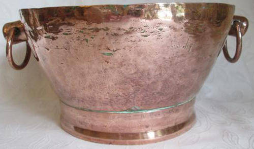 WHAT A BEAUTY !! LARGE AND HEAVY, HAND CRAFTED, VINTAGE SOLID COPPER BOWL WITH CHUNKY HANDLES AND COPPER RINGS. LOADS OF CHARACTER, A LITTLE BATTERED AND HIGHLIGHTED WITH TORQUOISE VERDIGRIS. WEIGHT 1,480kg, HEIGHT 14cm, TOP DIA 26.5cm, BOTTOM DIA 18cm.