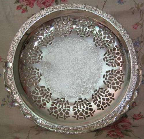 R1.00 SILVER PLATED CAKE BASKET WITH HANDLE, STANDING ON THREE BUN FEET. AS NEW CONDITION.