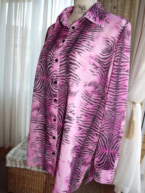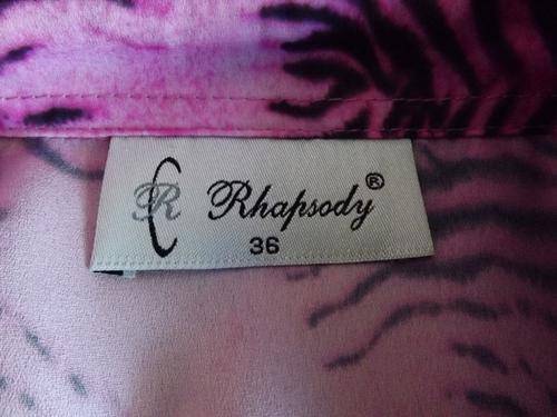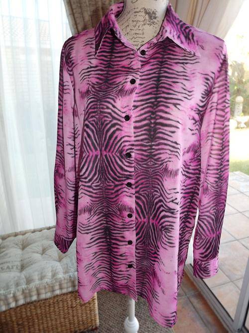 ONE NEW, BEAUTIFUL RHAPOSDY DESIGNED LADIES COLLARED BUTTON SHIRT IN PINK AND BLACK ANIMAL PRINT WITH LONG SLEEVES. BOUGHT, BUT NEVER BEEN WORN. LADIES SIZE : 36