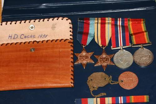 So here I have all four medals belonging toÃÂÂÂ Mr H.D. Cocks, while he was fighting for his country during the 2nd World War, all of these medals seem to be in a nice clean condition, I also have his wallet that is dated 1951 that will go to the winner of this auction. There are also his original dog tags and this makes it so more collectable. Please view my other auctions as wll.