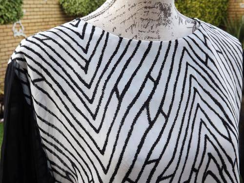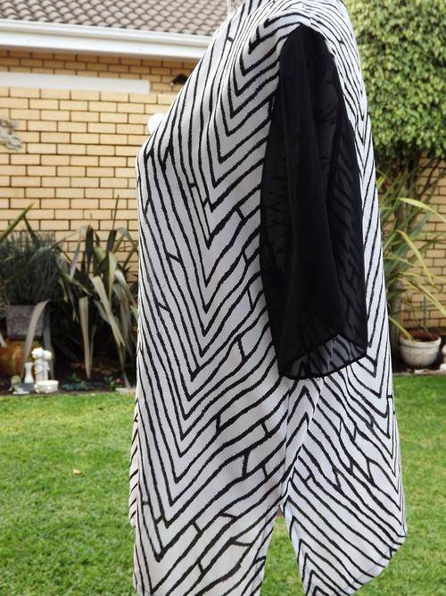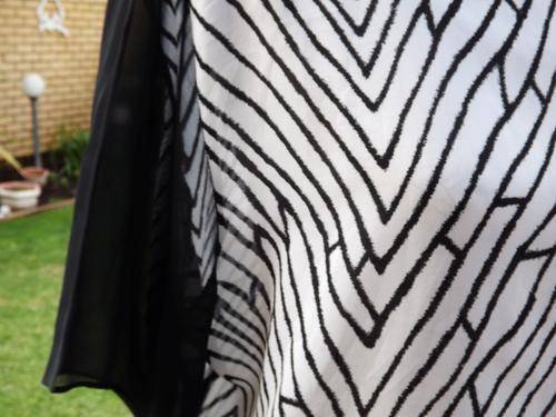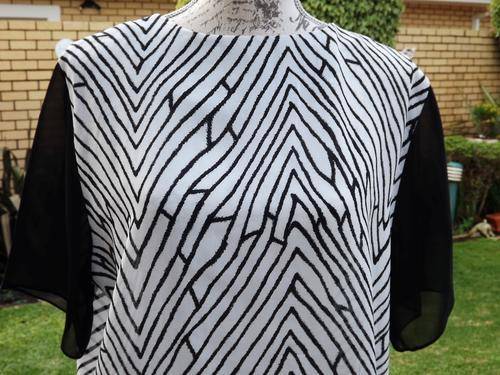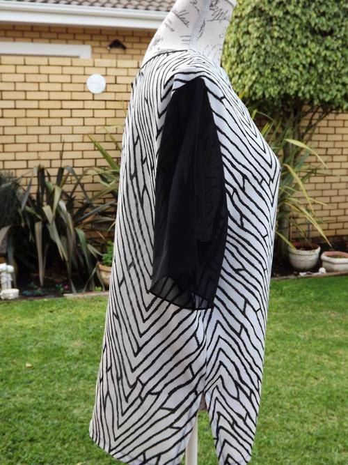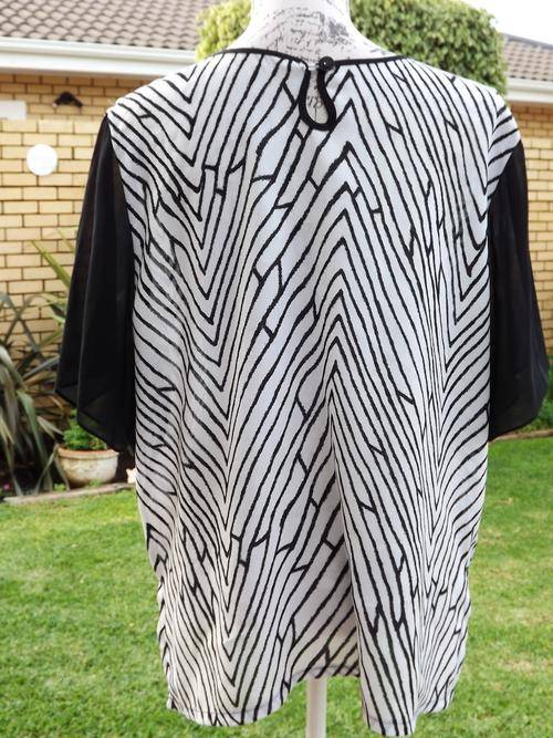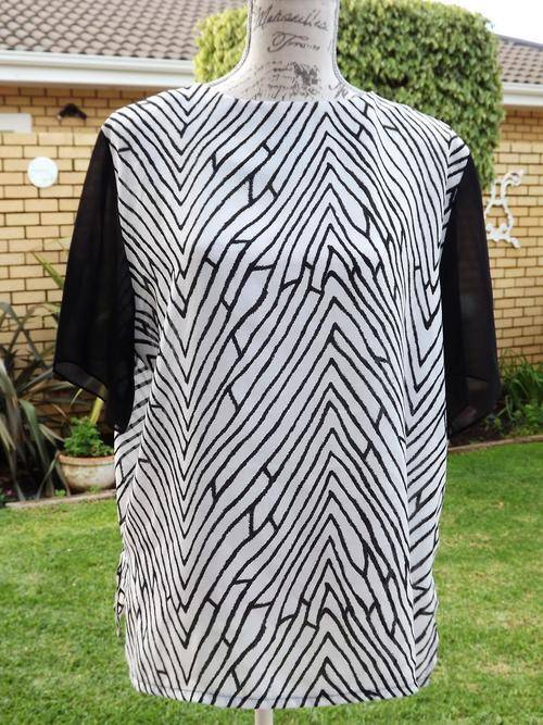 ONE LADIES SOFT NON CREASE FABRIC BLACK AND WHITE ABSTRACT DESIGN WITH BLACK SHEER SHORT SLEEVED BLOUSE . LOVELY WASH AND WEAR FABRIC - NO IRONING NECESSARY! NEVER BEEN WORN. IN LADIES SIZE MEDIUM .