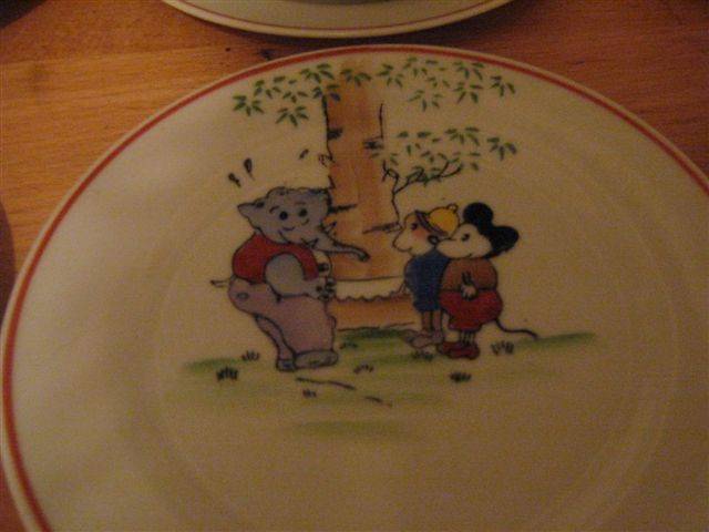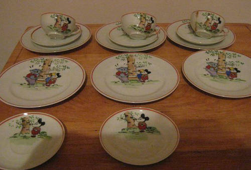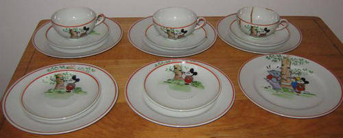 SELECTION OF A HAND PAINTED, VINTAGE DINNER SET DECORATED WITH MICKEY MOUSE AND FRIENDS, USED BY CHILDREN TO TEACH THEM THE ART OF FINE DINING. IT CONSISTS OF 6 DINNER PLATES CIR 16.5CM, 5 SAUCERS CIR 11CM, 3 CUPS, 1 WITH DAMAGE, HEIGHT 4CM, CIR 7.5CM.THEY ARE ALL IN PERFECT CONDITION OTHER THAN THE CUP I MENTIONED.