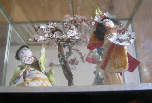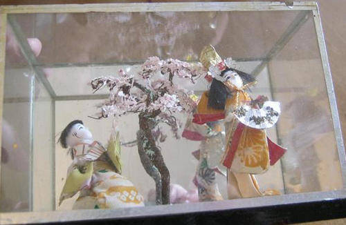R1.00 UNUSUAL, ORIENTAL GEISHA DOLLS IN MIRROR BACK GLASS BOX, GOOD VINTAGE CONDITION..