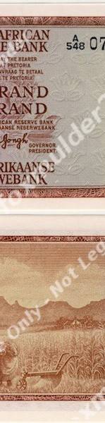 These are South African R1 notes signed by reserve bank governor T.W. de Jongh, in brilliant uncirculated condition. They are first edition notes printed and issued in 1972, as such the springbok appears as the watermark.