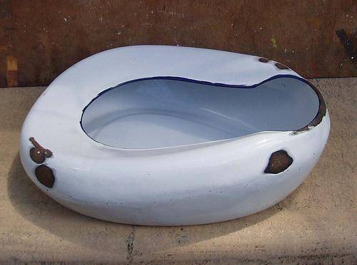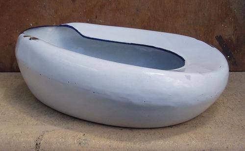 A MUST HAVE IN ANY VINTAGE ENAMEL COLLECTION. GENUINE OLD BED PAN, KEY HOLE SHAPE, WHICH COULD STILL BE USED. A FEW SURFACE CHIPS, BUT NO MAJOR DENTS. LIGHT RUST HERE AND THERE, BUT GENERALLY IN EXCELLENT CONDITION. MEASURES APPROXIMATELY 34X28X10CM. POST TO ANY SOUTH AFRICAN DESTINATION R42.