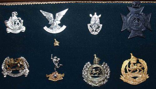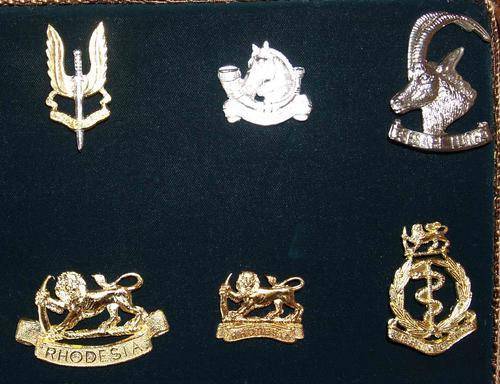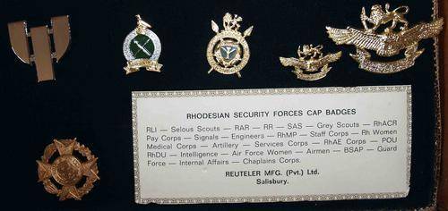 This set of 26 Rhodesian badges carries my personal guarantee that they all 100 percent genuine (not replicas, as is the case with those sets in the two-door cabinets), the exact badges issued to the Rhodesian military forces. This set was manufactured by Reuteler Manufacturing, the company that manufactured all the badges for the Rhodesian Military.