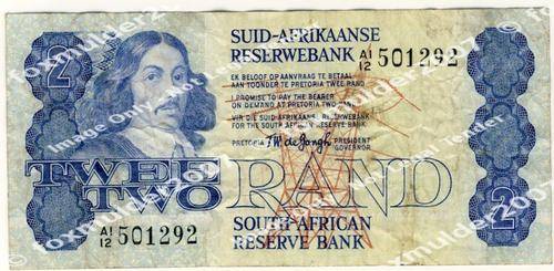 This is a South African Two Rand note signed by reserve bank governor T.W. de Jongh. It is a fourth series note printed and issued in 1978, this specific note appear with the A1-12 prefix. The note is in an Fine (F) condition in my estimation , but please look at the images above to judge for yourself.