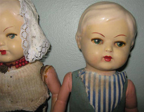 R250.00 !!! ANTIQUE PAIR OF DUTCH DOLLS, BISQUE HEAD, COMPOSITE LIMBS, STRAW STUFFED BODIES.