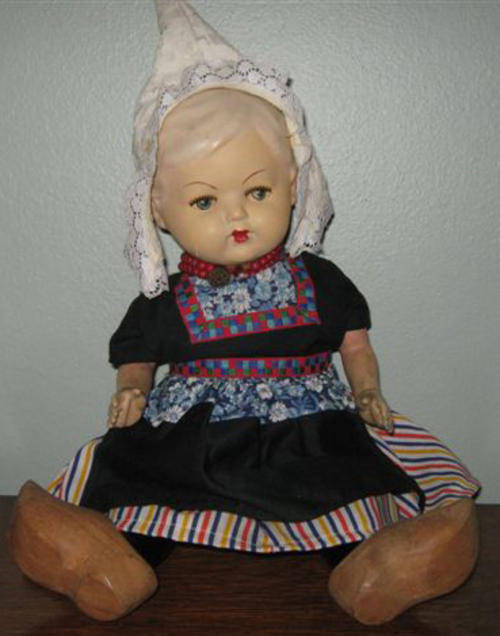PAIR OF ANTIQUE DUTCH DOLLS, THEIR OUTER CLOTHING IS NOT ORIGINAL, I THINK HER HAT AND THE HAND CARVED, WOODEN CLOGS ARE ORIGINAL TO THESE DOLLS. THEIR FACES ARE BISQUE AND ARE IN GOOD CONDITION, THE LIMBS ARE COMPOSITE AND THERE IS DAMAGE CONFINED TO THE JOINT AREAS AND SOME FADING WHICH IS CLEARLY SHOWN IN THE PICTURES. THE BODIES ARE CLOTH STUFFED VERY FIRMLY WITH WOOD SHAVINGS. THEY ARE APPROX 34 CM TALL. I HAVE NOT CLEANED THESE DOLLS OR THEIR CLOTHING, BUT LEFT THEM AS I FOUND THEM.