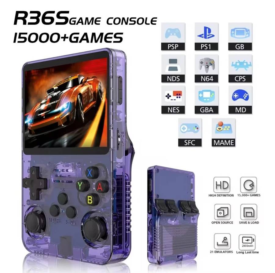 The R36S handheld console is a versatile device designed for retro gaming enthusiasts. It supports a wide range of emulators, allowing users to play thousands of classic games across systems like NES, SNES, Sega Genesis, GameBoy, and PlayStation 1. Its 3.5-inch IPS display provides clear visuals, while the ergonomic design ensures comfortable gameplay. The device includes dual analog sticks, shoulder buttons, and an intuitive button layout for a smooth gaming experience.