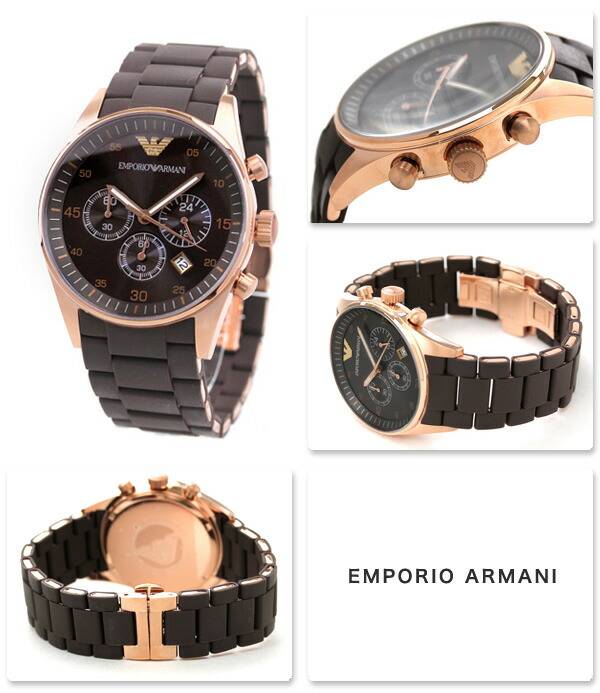 Elegance meets sport in this sophisticated watch by Emporio Armani. It features a rose gold ionic-plated case and a brown dial for a look of utter refinement. The three-eye chronograph movement and date window add extra functionality, and the stainless steel bracelet is brushed with rose gold IP and wrapped in brown silicone for a strong, smooth finish.
