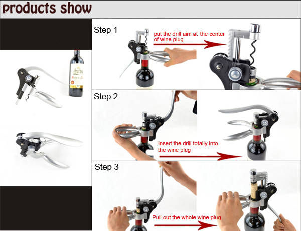 Firmly grasp the grip handles with one hand and swing lever to full open position. Put the opener over the bottle until it stops in the exact position. Grip the bottle neck firmly with the grip handles. The black screw comes out of the metal axis.