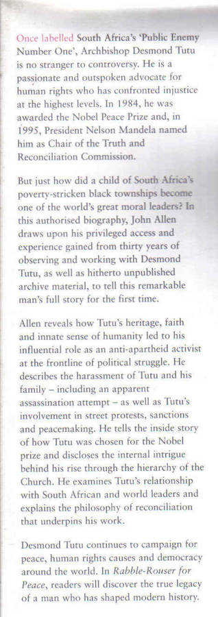 Ref 320 Rabble Rouser for Peace The authorised Biography of Desmond Tutu by John Allen Hard Cover Published by : Random House 2006 ISBN 184413571 3 has some B/W photographs R70 Mkt Prc R250 Condition - almost mint - very slightly scuffed top of fly leaf . Book Cover– excellent ; inside - excellent 481 pages Size - 240mm x 165mm x 45mm thickness weight 870grams Postage within South Africa R40