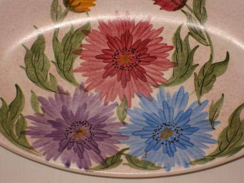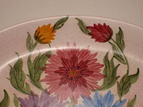 blue, mauve and yellow flowers and green leaves, on a mottled pink ground.