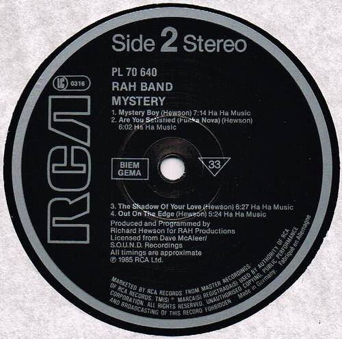 1985 German RCA pressing, release number PL 70640, of album by RAH BAND: Mystery. The track details are as shown on the images provided. The record has a number of faint and ineffective sleeve-scratches, otherwise in a seldom played, very good plus condition. The cover has very lightly scuffed corners and edges, a lightly bumped lower right corner-tip, plus a number of edge crinkles & very faint ring-wear, otherwise in a near excellent shape. VG+ / VG+ |