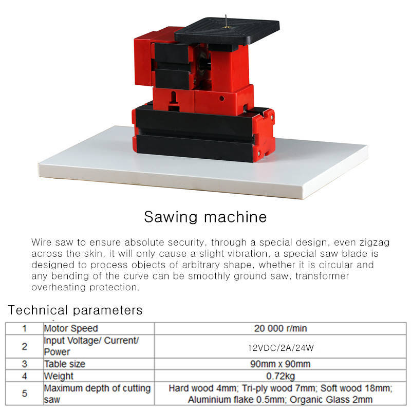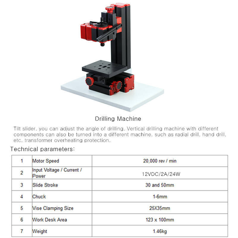 Drilling machine Technique Data: 1) Motor speed: 20,000rpm 2) Power: 12VDC/2A/24W, 3) Slide travel: 30 --50 mm 4) Stroke: 25mm 5) Clamping dimensions: 1 to 6 mm 6) Working area: 123 x 100mm 7) Material: Carbon steel, Aluminum, ABS 8) it can process wood ,soft-aluminum, brass, copper, plastics, other soft, colored etc.