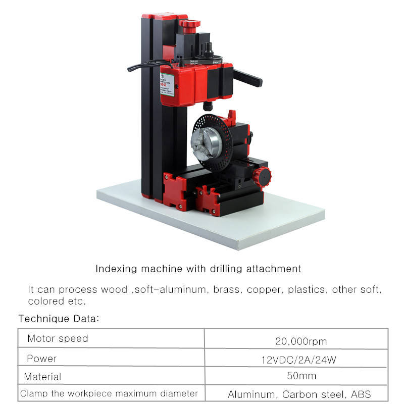 Indexing machine with drilling attachment Technique Data: 1) Motor speed: 20,000rpm 2) Power: 12VDC/2A/24W, 3)three-jaw chuck to clamp the workpiece maximum diameter of 50mm 4) Material: Aluminum, Carbon steel, ABS 5) it can process wood ,soft-aluminum, brass, copper, plastics, other soft, colored etc.