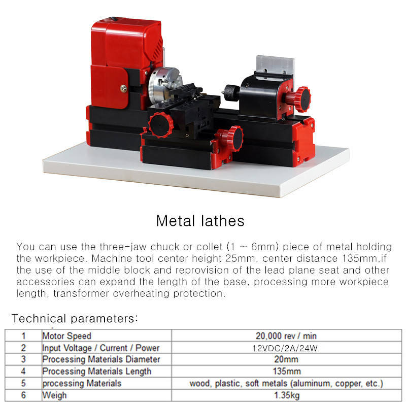 Metal lathes Technique Data: 1) Motor speed: 20,000rpm 2) Power: 12VDC/2A/24W 3) Tree 3-jaw chuck (self-centering) 4) The maximum diameter of the processed materials: 20mm 5) Length of processing materials: 135mm 6) Material: Carbon steel, Aluminum, ABS 7) it can process soft-aluminum, brass, copper, wood, plastics, other soft, colored and precious metals