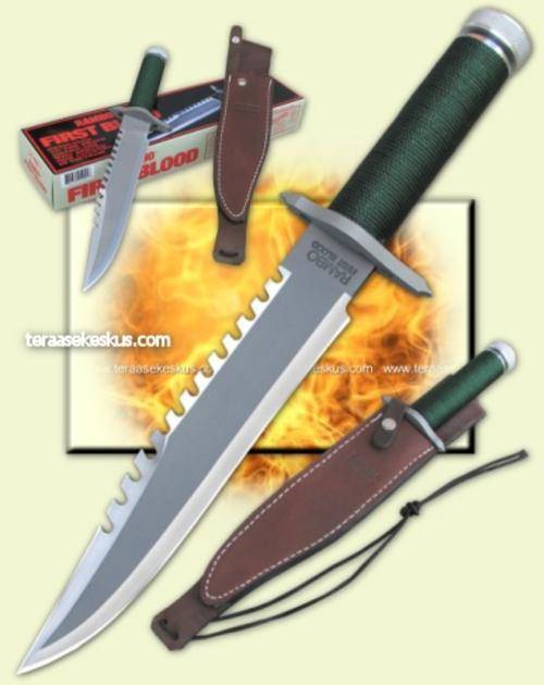 This knife has proven to be the ultimate outdoor and survival tool. It will cut, chop, slash, or smash just about anything you can put in front of it. It can be used to kill both fish and game and will also field dress and prepare them for the table as well. And when you look at its quality, it's got to be one of the best bargains for your money. These blades are made out of SAE 10 stainless steel and are dipped in a special anti-rust solution before having a black baked on finish. Each knife comes with a good utility edge that will cut right out of the box and, with a little work, can be made hair shaving sharp. The handle is designed to provide a comfortable secure grip, resist chipping, cracking or breaking, and to last practically forever. The Rambo knife is the standard knife for the survival in the wild . Excellent for cutting anything thick or rough and chopping down saplings and small trees. Makes a fearsome emergency weapon too.. Specifications: -Light brown Sheath included,With Rambo ingraved into sheath