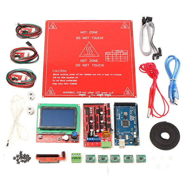 1 x Ramps 1.4 board 1 x Meage 2560 for Arduion 1 x Mk2b heat bed 1 x 12864 LCD Screen 3 x endstop 5 x A4988 motor driver 1 x 1 meter gt2 belt 2 x 20 tooth Pulley 1 x 12v 40w Heater Reparap Cartridge 1 x 100k ohm NTC 3950 Thermistors with cable 1 x USB cable 1 x Smart Adapter 2 x FC Flat Cable