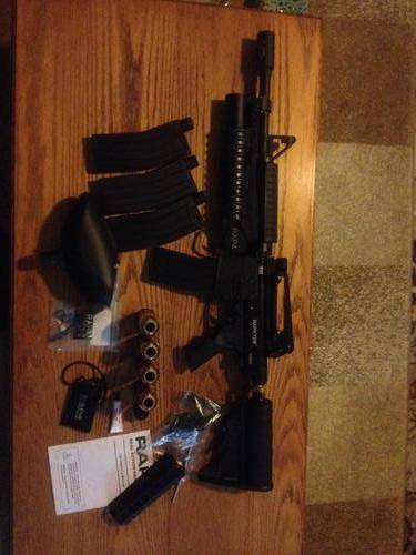 The gun has a split fire duel feed adaptor on it, so you can shoot paintballs with the magazines or a hopper.