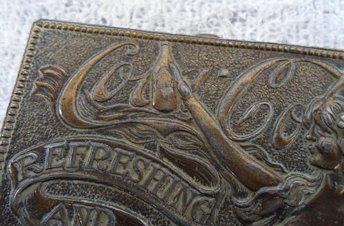 QUITE RARE NOW AND SELDOM SEEN ANYMORE, DESIRABLE 1970'S METAL BELT BUCKLE MADE IN A COCA-COLA ADVERTISEMENT DESIGN WITH SEMI-NUDE FANTASY FIGURE DRAPED ACROSS THE SURFACE IN RELIEF. FEATURES LADY HOLDING A COKE BOTTLE IN WHIP-LASH ART NOUVEAU STYLE. PLEASE NOTE I DON'T THINK THIS IS GENUINE COKE ITEM, BUT RATHER A LIMITED EDITION DESIGNER PIECE, PROBABLY EVEN MORE DESIRABLE AND VALUABLE? IN GOOD CONDITION, JUST LIGHT AGE WEAR TO SURFACE, BUT NO SPLITS OR REPAIR, BELT CLASP INTACT. MEASURES ABOUT 9,5 X 7 CM.