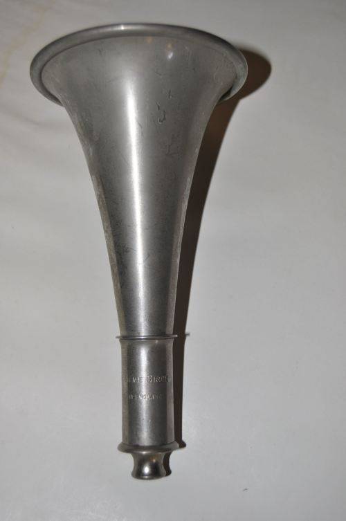 Original, quality, post war, whistle / horn of the trumpet form, in nickel plate and used by the early cyclists. This example is stamped "The Acme Siren", "Made in England" and has the original eye for a lanyard rope and much of the original black interior paintwork is still visible. Polished and lacquered, complete and in good and working order. 3.75" flare and 7" tall.