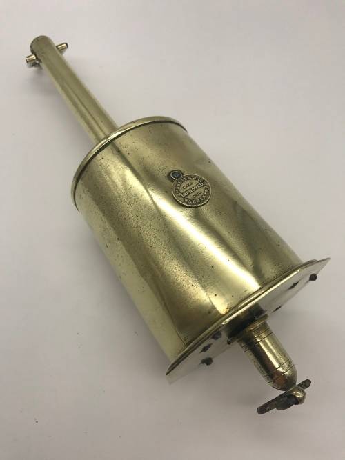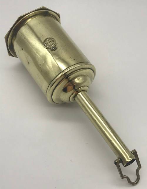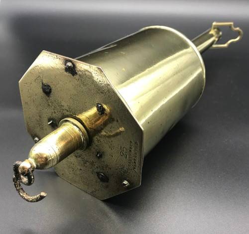 This rare piece was manufactured by ‘Salters England.’ A bottle jack is a Victorian device for turning a spit, which was hung in front of a fire or from a jack rack which was suspended above a fire. The clockwork mechanism inside this jack rotates the meat to roast it evenly (the meat is turned for several rotations in one direction and then back in the other). It is wound by a brass key (key included). It is stamped on the base ‘SALTERS & CO’ and the no. ’25.’ It is in great condition for its age with the odd minor dent. For more information on this device click on the link below.