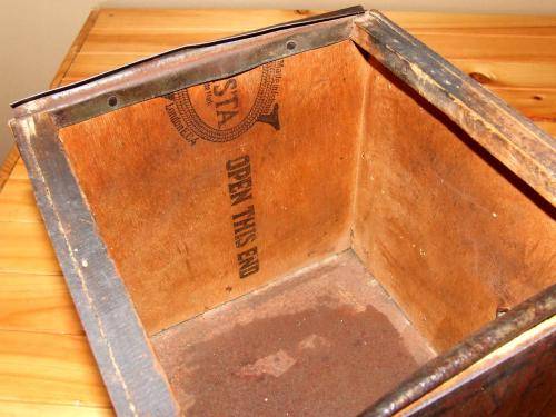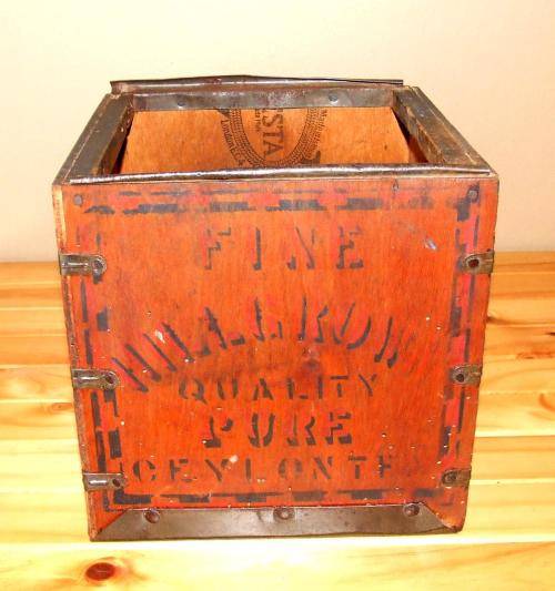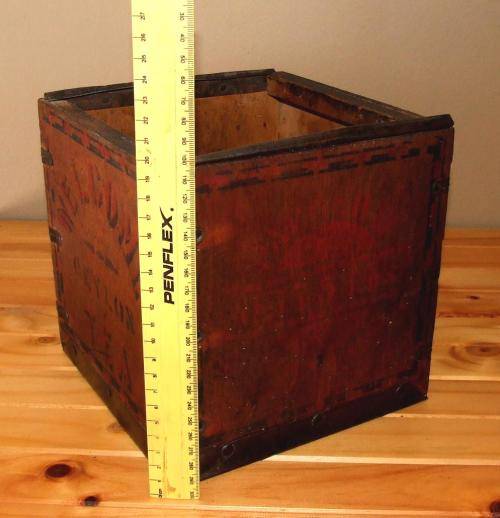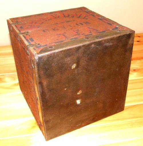 A small 200mm square Ceylon tea box. Wood & metal. Sliding lid missing but easy to replace. Some borer holes. (no wood borer) The box has a nice antique patina. Metal bottom, lid slides and corner clips. |