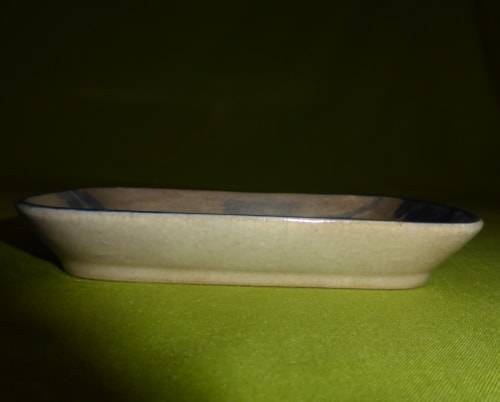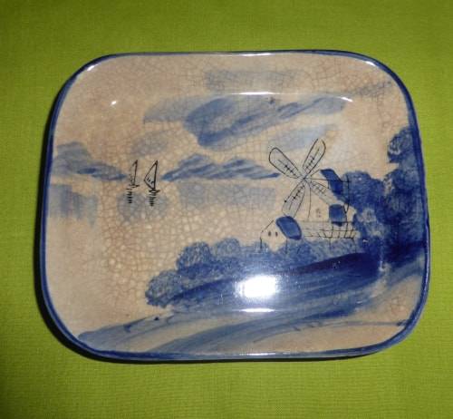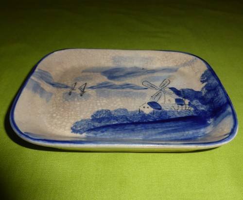 This dish is in excellent condition for its age! It is hand-painted, delft-style, but with no backstamp. Size is 15,5cm x 12,5cm and 2,5cm high on the sides. It weighs 300g.