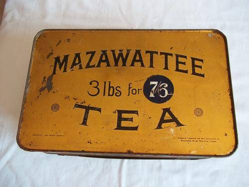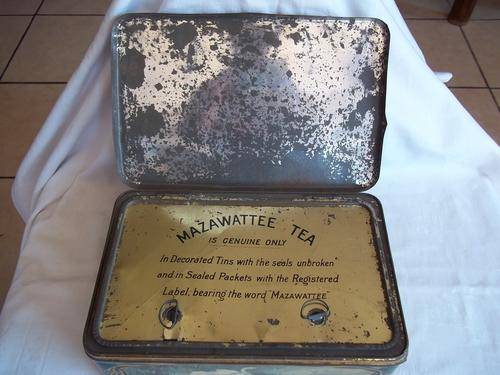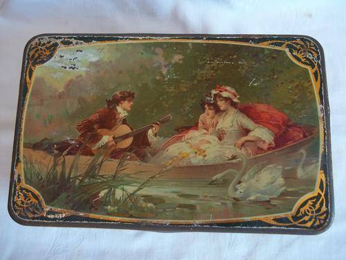Rare antique Mazawattee Tea tin - man serenading 2 ladies on boat. From research done, it would seem as though this rare tin is Circa 1900, and is 3 pound nett weight. The tin depicts a man serenading 2 ladies on a boat on top, with swans around the sides. The tin is marked Mazawattee and has "Mazawattee 3lbs for 7'6 Tea" at the bottom. It has a "stay fresh" flap under the lid. This flap has the inscription " Mazawattee Tea is genuine only, In Decorated Tins with the seals unbroken and sealed packets with the registered label bearing the word Mazawattee". The tin measures 28cm x 17cm x 8cm. As can be expected, the tin shows wear due to age. However, a lovely piece of history to display in your home.