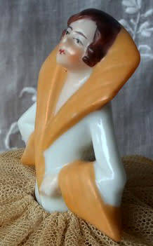 ANTIQUE COLOMBINE, LADY CLOWN, PIN CUSHION PORCELAIN HALF DOLL. PERFECT CONDITION HEIGHT OF DOLL 5cm, INCISED NO D 6696