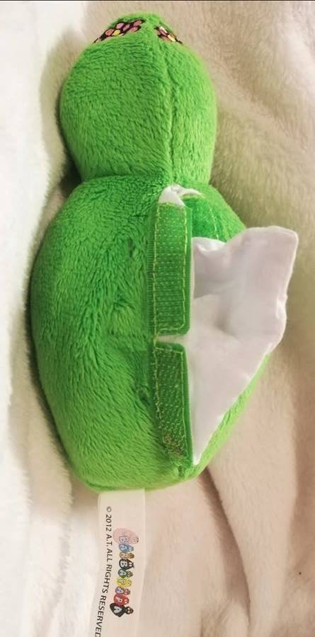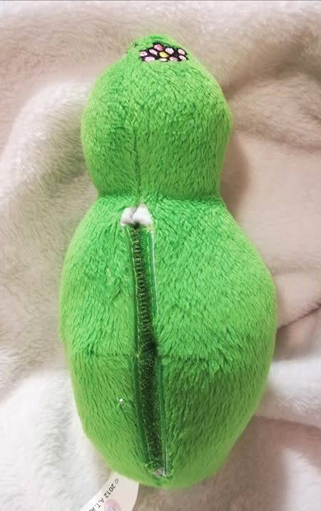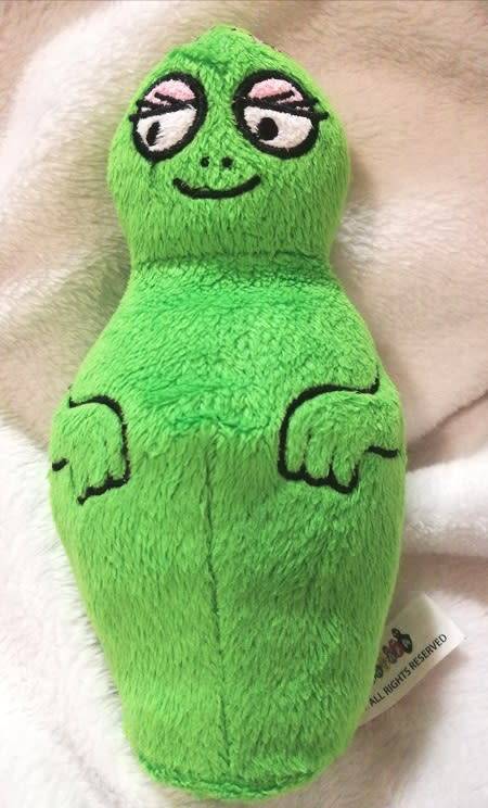 Super soft green fur. White, black and pink sewn facial features. Cute, yellow and pink flowers on her head. Hidden pouch on back and sealed with velcro. Barbapapa tush tag. Toy in very good condition.