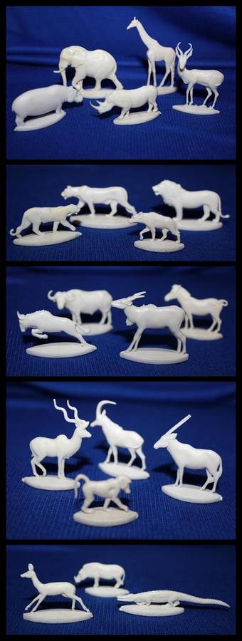 The set comprises a Lion (92/61), Lioness (93/61), Elephant (94/61), Rhinoceros (95/61), Hippopotamus (96/61), Giraffe (97/61), , Zebra (99/61), Leopard (100/61), Buffalo (101/61), Baboon (102/61), Crocodile (103/61), Hyena (104/61), Eland (105/61), Gemsbok (106/61), Kudu (107/61), Impala (108/61), Sable Antelope (109/61), Wildebeest (110/61), Warthog (111/61) and the Springbok (431/61).PLEASE NOTE CHEETAH (98/61)IS NOT IN THE SET