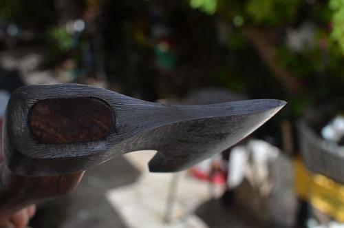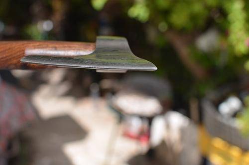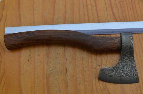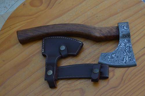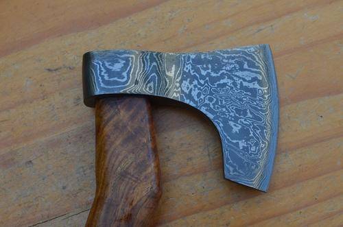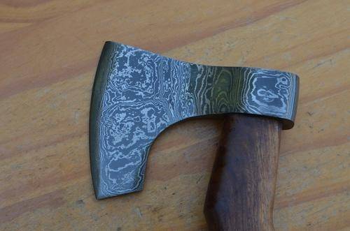 Blade of the axe is hand forged with above 300 Layers of 1095 and15N20 high carbon tool steels, with nickel layer.Extreme heat treatment has been applied to achieve a tempered steel level of 56 to 57 HRC .The axe handle is made of Walnut Wood.