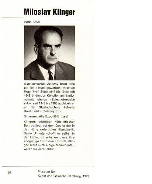 Famous glass artist Klinger Miloslav (1922-1999) attended the High School of applied Arts for Glassmaking in Zelezný Brod during the period 1938-1941, then the studio of Professor Charles Štipl at VŠUP Prague during the period of 1942-1948. He worked successfully as artistic designer for several glass works.