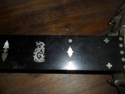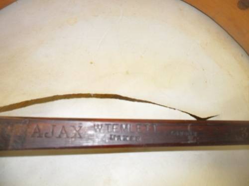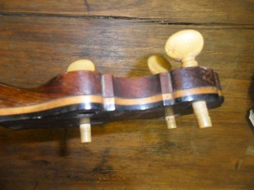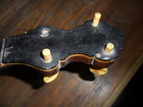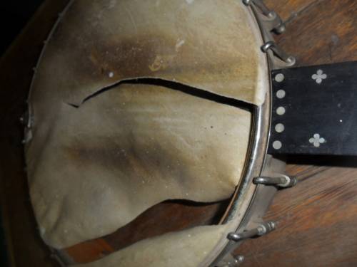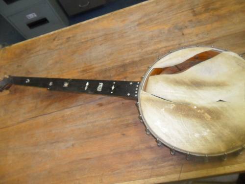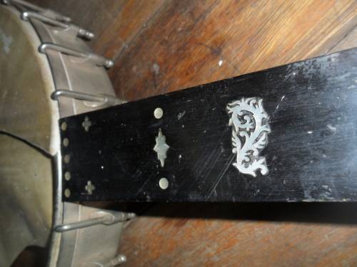 The frame and woodwork on this item is in good condition, but it will need new pigskin, one turning peg and a string peg. The banjo has beautiful abalone inlay - See pictures.
