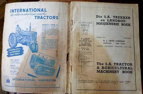 A Rare Find Die S.A.Trekker en Landboumasjienerie Boek. The S.A. Tractor & Agricultural Machinery Book. Uitgawe 1953/4 Edition. Bilingual - English and Afrikaans The book is a bit tattered, the cover is loose and the pages have grubby marks from use over time. The pages have turned brown. No pages are missing. Softcover - 144 pages. Size is 180mm x 240mm. The following are mentioned: Allgaier, Allis Chambers, Bolinder-Munktell, Case, Caterpillar, David Brown, Deutz, Ferguson, Field Marshall, Fordson, Fowler, Hanomag, John Deere, Lanz, M.A.N., Massey Harris, Minneapolis Moline, McCormick International (Farmall & other), Nuffield Universal, Oliver, Oliver Cletrac, Steyr and Volvo. Also contains earth moving tractors, bulldozers, graders, scrapers and farm implements. Signed for postage in SA, at buyers own risk, will be R23. Please allow enough time for the 15 photos to download and scroll down.