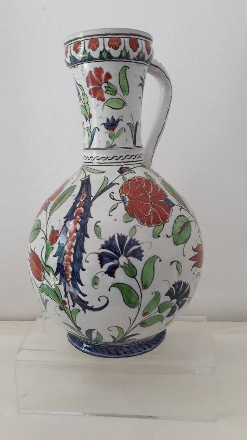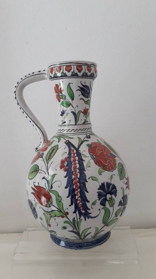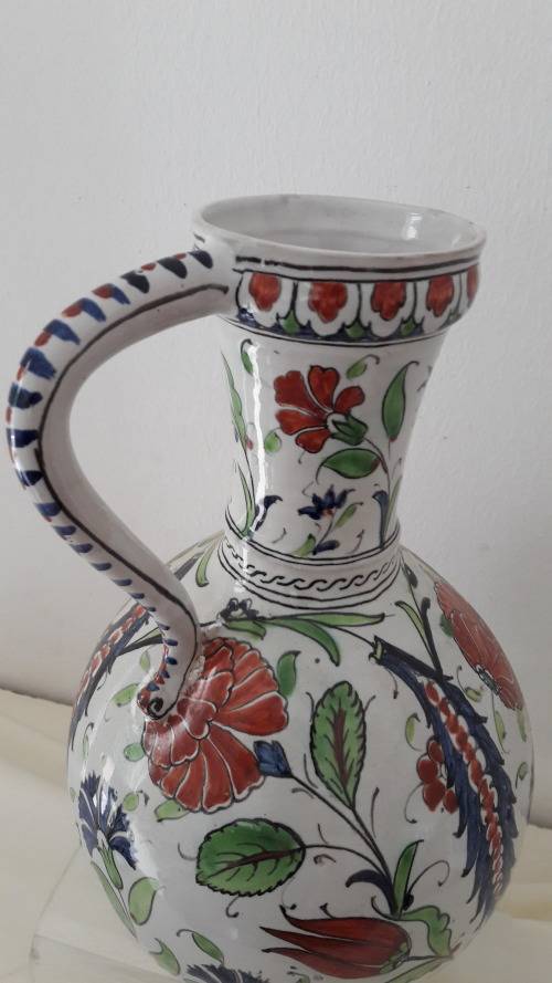 Offered for sale is a rare and collectible Catagalli Italian hand made ceramic ewer /jug vase with a single strap handle attached extending from the apex of the jug/vase to the shoulder of the bulbous body . This item was made in Florence Italy in the late 19th or early 20th Century by the famous Cantagalli ceramic studio whose ceramics are signed with a hand painted cockerel mark on the base . The vase is decorated in the Iznik style which is derived from antique ceramics made in the town of Iznik in Anatolia/Turkey in the Ottoman Empire between the 15th and 17th Century. These colourful ceramics were much prized and collectible and were " copied" by Cantagalli in Italy and by Theodore Deck and Samson French ceramic manufacturers in the 19th Century. This vase/ewer is tin glazed majolica hand painted with a stylized floral motif of tulips, carnations and hyacinths . The palette/colours of the vase are typical of the Damascus style Iznik ceramics with olive and sage green, brick red and a deep blue-mauve with detailing and borders in black.