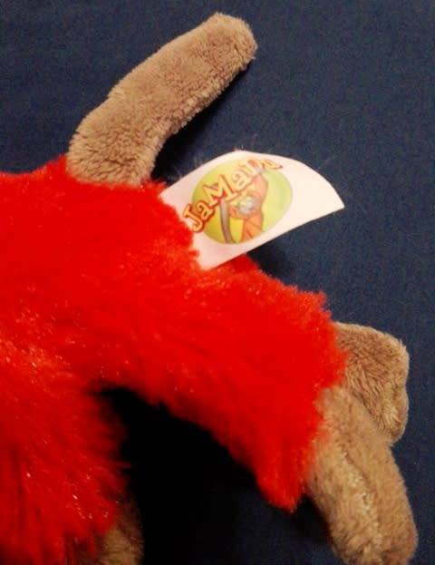 Lovely orange monkey with bright yellow eyes, long orange fur and grey paws and tail.
