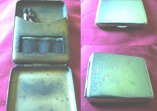 LOWRIE'S SCOTCH WHISKEY, ORIGINAL PLATED/BRASS? FINISH INSIDE MATCH BOX P.PAT. No. 31192, R. REGD. NO. 694143! ENGLISH MADE. WITH "I THINK?" THE ORIGINAL STRIKER PAPER AND EVEN STILL HAS SOME MATCHES INSIDE!!! - REAL COLLECTOR'S ITEM!! If you want this item new, please do not bid, selling as a COLLECTORS' piece!!! NICE DISCUSSION POINT FOR THE BAR