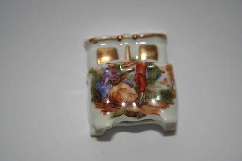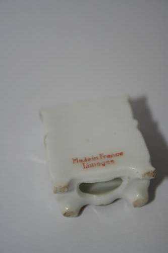 What an absolutely quaint little Limoges sideboard with romantic scene and gold lustre trimmings. A little wear on the gold lustre but no chips. Exquisite collectable with seemingly original markings. see below. 2.9cm X 3.2cm.