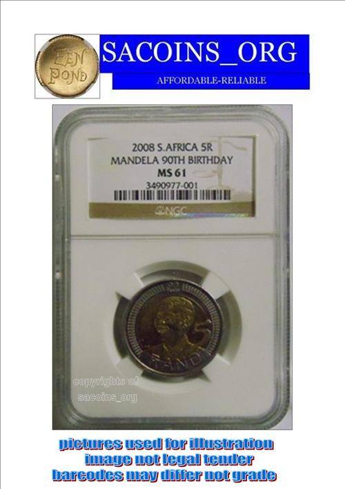THIS IS AN AUCTION FOR -- 2008- MANDELA 90TH BIRTHDAY R5 COIN MS61 -GRADED BY NGC- NUMISMATIC GUARANTY CORPORATION- OUR CERTIFICATE INCLUDED ---